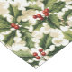 Holiday table runner is shown with a festive holiday holly print design.