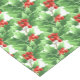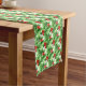 Holiday table runner is shown with a festive holly print design.