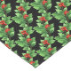 Holiday table runner is shown with a festive holly print design.