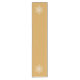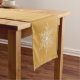 This Christmas holiday table runner is shown with a gold background colour and has a festive Christmas white snowflakes print design.