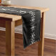 This Christmas holiday table runner is shown with a black background colour and has a festive Christmas snowflakes print design.