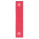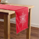This Christmas holiday table runner is shown with a red background colour and has a festive Christmas white snowflakes print design.
