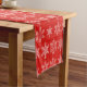 This holiday table runner is shown in a red colour with a festive Christmas snowflakes print.