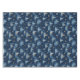 Tablecloth in a holiday themed toile pattern of snow covered evergreens. deer and scattered snowflakes, on a deep, midnight blue background