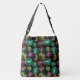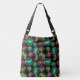This cross-body tote bag is shown with a multi coloured Christmas holiday snowflakes print design.