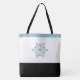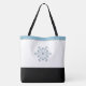 This tote bag is shown in with an image of a blue jewelled snowflake. Black handle straps, blue top trim and black bottom over white background with light grey accent stripes.