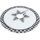 This holiday tree skirt is shown in a black and white gingham and snowflake country look.