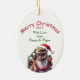 Here's a beautiful fun ornament for that special son, nephew, or grandson that loves dinosaurs. The front features an image of a fierce looking T-Rex dinosaur dressed in his winter hat and Santa suit. He stands in front of a decorated Christmas tree. Your child's name is in red at the top left. The back of the ornament has another image of the dino carrying a pack of gifts, and has several text fields for you to customise. Make it say whatever you'd like!