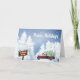 Christmas cards for the festive holiday season. FRONT: A beautiful illustration of snow capped forest trees in a blizzard through which a red pick up truck laden with Christmas trees is driving. A cute sign has the words "No chopping of trees" on it. Personalise the wording to suit your requirements.