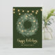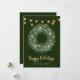 These trendy and stylish holiday cards feature a pretty, watercolor holiday wreath with gold coloured star accents and elegant string lights, with modern script calligraphy on a dark, forest green background.