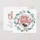 A festive circle of holly and leaves, a moose, and a merry Christmas wish. For a vintage old fashioned vibe. A unique square format holiday card with a red script typeface. Personalise with your names on the back of the card. Add a verse if you like!