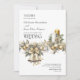 Winter wedding invitation with wedding details and information on the back. Timeless seasonal design featuring elegant typography, festive holly branch with golden berries, light gold baubles, wedding bells with a gold bow, evergreen pine, gold and white candles and a poinsettia flower. For co-ordinating invitations, stationery and day-of-event decor, please browse my Holly Bells Wedding Collection or message me to add any additional items you need.