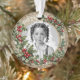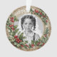 A vintage style holly frame for your custom photo, with custom commemorative text on the back, on this round acrylic Christmas tree ornament.