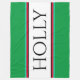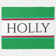 This festive holiday design features HOLLY text inside a wide white centre stripe highlighted with black, yellow, and orange pinstripes against bright kelly green outer stripes.