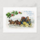 A stagecoach being pulled by four horses through the snow and carrying many passengers, one of whom is playing a horn in a vintage Christmas postcard from 1914.
