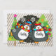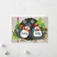 Holly Jolly Skating Penguins holiday greeting invitation card features a background of grey and white diagonal stripes, a black circle with white polka dots, two decorated Christmas trees, and two cute ice skating penguins in winter hats and striped scarves in bright colours. The inside features two little snowflakes of bright pink and green and an area you can add your text message and name(s). We have matching postage, stickers, return address labels, and envelopes.