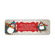 Holiday Holly Jolly Skating Penguins return address labels with a grey and white diagonal stripe background, two cute penguins in ice skates, winter hats, and striped scarves in bright colours, and a red and white frame where you can add your name and address before ordering.