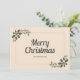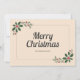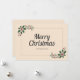 A simple and minimalist Merry Christmas holiday card with a discreet border, ornate on its two opposite corners with a delicate illustration of holly leaves, berries and pine branches, all on a beige background.