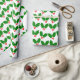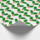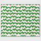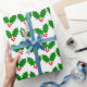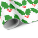 This wrapping paper has a Christmas design of holly leaves and berries scattered about on a field of white.