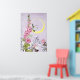 A little elf riding a moth visits a pink hollyhock. Below are Chinese bellflowers and dahlias with a lavender background in a vintage illustration from 1920.