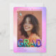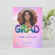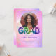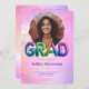 Celebrate the graduate in style with this vibrant and modern holographic balloon lettering graduation invitation. Featuring two customisable photo spots, this fun and festive design is decorated with shimmering confetti and eye-catching balloon text that spells "GRAD" in rainbow metallic hues. The rounded edges add a sleek touch, while the mix of playful and bold typography makes it a standout choice for any high school or college graduation celebration. Perfect for announcing the big milestone with a fun and energetic vibe! On pink background