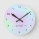 Modern wall clock featuring your name in an elegant handwritten script with swashes over a colourful holographic gradient in pastel pink, purple, blue and green. This stylish and feminine wall clock is great for a girly girl and makes a great gift for her.