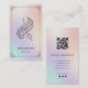 Make a lasting first impression with this luxury holographic hair stylist business card featuring a minimalist scissors illustration and modern QR code design. The soft iridescent pastel gradient creates a high-end, feminine, and professional look perfect for salons and independent stylists.