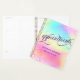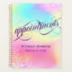 Iridescent appointment planner for a makeup artist, nail artist, lash artist, hair stylist or similar with a printed holographic texture effect and the faint white outlines of flowers like a lace effect at two of the corners. Appointments is written across in a dark purple swirly calligraphy script.