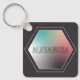 Stylish grey keychain with holographic retro style y2k hexagonal gradient frame in pastel light colours including blue yellow pink with a name in the middle. Modern style accessories.