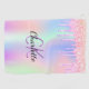 A rainbow, unicorn, holographic coloured background in pink, purple, and mint green decorated with faux glitter drips, paint dripping look. Personalise and add a name, your monogram initials. The name is written with a hand lettered style script.