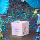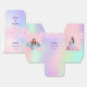 Pink, purple, mint green holographic background. Personalise and add 2 photos, name, age and a date. Text on the lid: Thank you for coming!