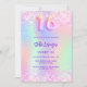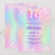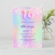A girly and feminine Sweet 16 party invitation. On front: A rainbow, holographic coloured background in purple, pink, mint green. Decorated with blush pink confetti. Personalise and add a name and party details. The name is written with a hand lettered style script, purple coloured letters.