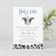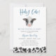 Cute farm theme boy's baby shower invitation card featuring watercolor illustration of a baby cow. The text says "holy cow! we are having a baby!"