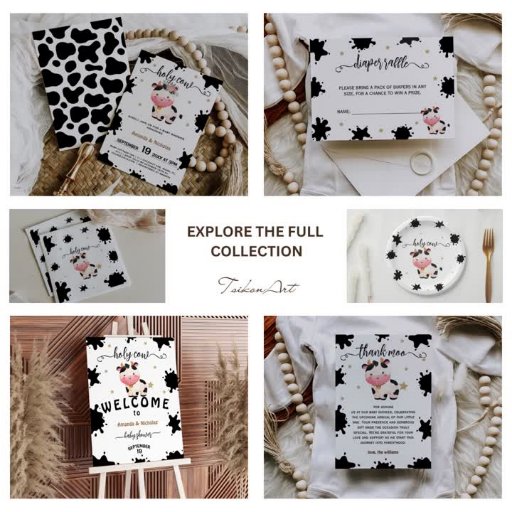 Boho watercolor minimalist cow themed gender neutral baby shower thank you card, with cute holy cow, handwritten script, black splashes, gold glitter stars, in a rustic-modern- bohemian style. 🐮 Don't forget to explore the full collection.