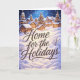 This folded greeting card captures the essence of the holiday season with a picturesque winter landscape. The cover features the phrase 'Home for the Holidays' in elegant cursive script, set against a starry night sky filled with twinkling lights. Below, a cozy wooden cottage glows warmly, surrounded by lots of fresh, untouched snow blanketing rooftops, trees, and the winding path that leads to the door.
