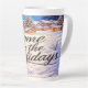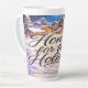 Wrap your hands around the magic of the season with this charming 'Home for the Holidays' latte mug. Featuring a serene winter night scene, the design showcases a cozy cluster of warmly lit wooden cottages nestled among snow-covered trees and hills, all under a twinkling starry sky. The elegant script adds a heartfelt touch, making this mug a perfect companion for sipping cocoa, coffee, or tea during the festive months. Whether you're gifting it or treating yourself, this mug brings the comfort of home and the joy of the holidays to every sip.