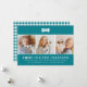 Our pet dog themed “Home for the Holidays” Christmas card features a collage of three square photos of your new puppy to share with friends and family. Personalise the text with a custom greeting, your last name or family, your pup's name, and the year. Modern teal blue design includes cute paw print, dog bone, and a coordinating gingham / buffalo plaid pattern on the back.