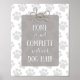 Scrapbook style typography poster with the phrase, "HOME is not COMPLETE without DOG HAIR." Faux ribbon and button on a background that has grey animal paw prints. Designed by Rycky Creations; elements from Pixelscrapper.