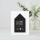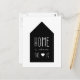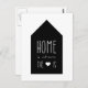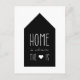 Inspirational postcard displaying the phrase "Home is where the heart is" in white against a black background in the shape of a house.