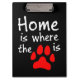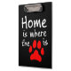 A wordplay with the quote "Home is where the heart is", this clipboard has the words "Home is where the [paw print picture] is", with the paw print picture in red, representing the "heart". The perfect gift for pet lovers.
