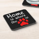 A wordplay with the quote "Home is where the heart is", this black hard plastic coaster has the words "Home is where the [paw print picture] is", with the paw print picture in red, representing the "heart". The perfect gift for pet lovers.