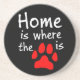 A wordplay with the quote "Home is where the heart is", this sandstone coaster has the words "Home is where the [paw print picture] is", with the paw print picture in red, representing the "heart". The perfect gift for pet lovers.