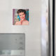 Kitschy fridge magnet has vintage 1950s style homemaker woman with "home is where the wine is" text.
