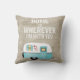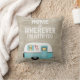 Home is Wherever I'm With You Camper Camping Travel Trailer RV throw pillow. Whimsical aqua blue camper with heart accents and tan rustic background accented with a rustic style "Home Is Wherever I'm With You" quote. Easily customise it yourself by adding your family name, camper name and date to the design.