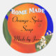 A custom sticker with vintage kitchen crate label art of oranges with small blossoms. The top reads Home Made in custom letters in white with a blue outline, you add your ingredient title and name in retro orange curly letters. Add your own custom text in script letters. Click Customise It to add or subtract text, change lettering style, background colours, even save your custom soap or canning label for later!