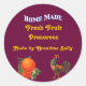 A custom sticker with vintage kitchen crate label art of oranges with small blossoms and a colourful crowing rooster. The top reads Home Made in custom letters in white with a blue outline, you add your ingredient title and name in retro orange curly letters. Click Customise It to add or subtract text, change lettering style, background colours, even save your custom canning label for later!