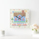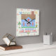 Decorate your wall with a personalized, country house square clock. This clock design is made to resemble a vintage cross stitch embroidery sampler. It shows a blue house made of "x"s with a bird, the sun and plenty of hearts and flowers in the same style. The background is beige with a slight check pattern to look like embroidery material. The clock numbers are also done in a needlepoint style.