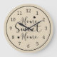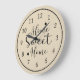 Home Sweet Home in modern script with simple numeric clock face on tan background