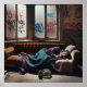 Displaced man sleeping in an abandoned building with his faithful cat homeless man emotional urban life, human condition ai art.