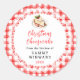 This fun and whimsical sticker features Christmas cheesecake on a white lace doily and red gingham background. It is perfect for labelling your homemade goods. The text combines handwritten script and serif fonts for a stylish and modern look.
